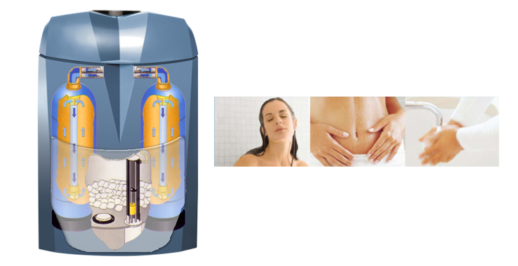 AQA Perla 雙罐式軟化採用傳統樹脂交換原理,以特有專利樹脂設計,當原水流經設備時,水中的硬度離子(鈣離子)將被吸附。當進行再生清洗還原模式時,專利樹脂床設計,只需使用比一般軟水機50%的用鹽量,即可將鈣離子釋出並將樹脂還原,回復待機狀況。再生清洗及淨化後軟水採用完全分離設計,可避免再生清洗後的鹽水與潔淨軟水相混合。