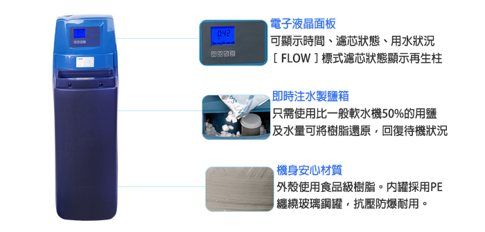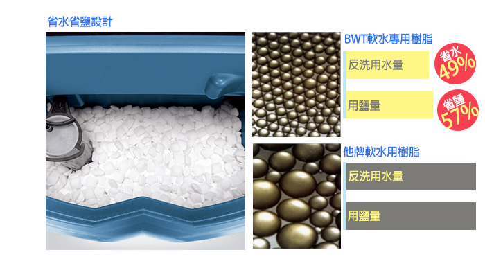 ● 即時注水製鹽設計,只需使用比一般軟水機50%的用鹽及用水量,即可將樹脂還原,回復待機狀況