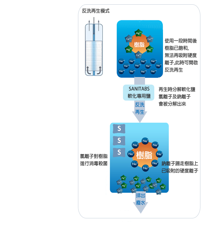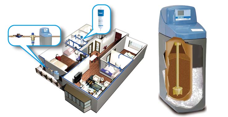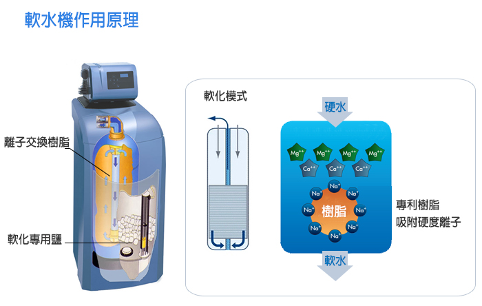 採用離子交換(Ion-exchange)技術,解決水中硬度離子(鈣、鎂離子)在水管和安裝在水管上的用水設備金屬表面結垢的問題