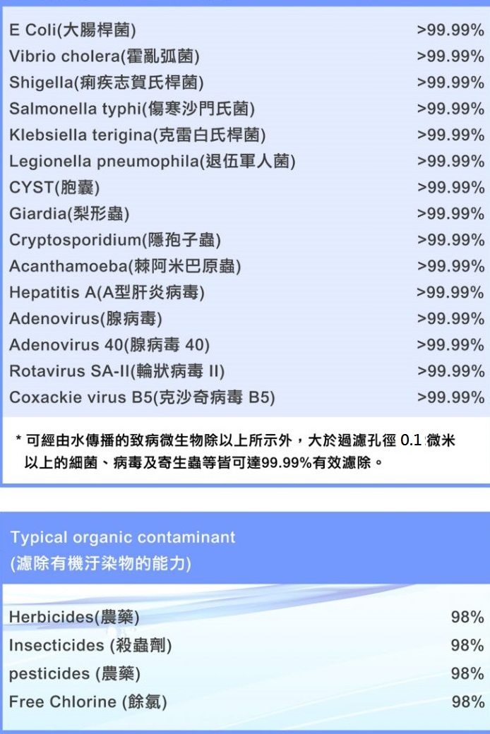 | ● | 榮獲ISO9001、NSF濾芯及通過SGS水質檢驗標準。 |